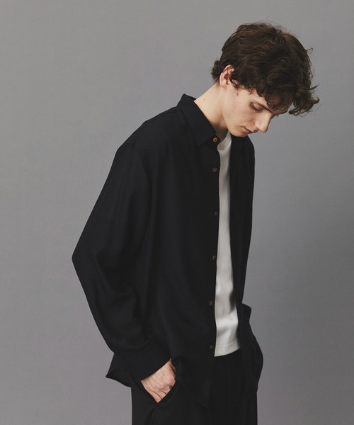 ◆拘り リラックスしたサイジングで羽織としてもインナーとしても活躍するキュプラウールシャツ。 素材の良さを活かし余計なディテールは排除しミニマルでクリーンな印象に仕上げました。 ウールのふくらみ感に加え、キュプラ混紡の為、上品なドレープ感があり 肩からストンと落ち、スタイリッシュに着用いただけます。 付属ボタンにもこだわり、艶消し加工を施した本貝ボタンを使用。 ケシ加工により派手な光沢をおさえマットで上品な印象に。 カジュアルからキレイ目まで幅広く合わせやすいクリーンなシャツに仕上げました ◆素材 家庭洗濯が可能なジャパンメイドウールファブリック。 縮みづらく洗えるウールを実現しています 縦糸にキュプラを織り込むことにより、上品な光沢となめらかな手触りを実現しました。 無地ながら、ビエラ織の上品な綾目がコーディネートに奥行きを与えてくれます ◆原産地 山形 ◆お手入れ方法 手洗い可能