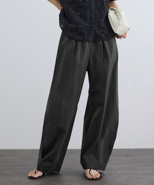 撥水加工&ウエストゴムで快適。体型カバーも叶う立体シルエットのカーヴィーパンツ ■デザイン/シルエット シンプルなトップス合わせでもこなれ感を演出するカーヴィーパンツ。 素材のハリを活かした立体フォルムで脚のラインを拾いにくく、 ボリュームがありながら腰回りはすっきり見え。バランスが取りやすくスタイルアップを叶えます。 ウエストはオールゴム+ドロスト仕様で楽な穿き心地と幅広いサイズ対応を実現。 ※商品番号:SHS35130と同型・同素材です。 新色のピンクは4月中旬頃予約開始予定です。 ■素材 コットン×リサイクルナイロンを高密度に織り上げたポプリン素材。 ほのかな艶とナチュラルなシボ感で大人カジュアルに最適な表情に仕上げました。 縦横で糸色を変え奥行きのあるカラーを表現。 撥水加工付きで雨の日や梅雨時期にも活躍します。 定番ベージュ・チャコールに加え、今季は軽やかなピンクが新登場。 ご自宅でお洗濯可能/マシンウォッシャブルで、撥水加工も施した機能も嬉しいポイントです。 ■コーディネート クロップドトップスでボリューム感を引き立てる着こなしや、 全身をゆるっとまとめたリラックススタイルもおすすめ。 デイリーから梅雨時期まで頼れる万能パンツです。 ■モデル身長:166cm 着用サイズ:M ーーーーーーーーーー 裏地:なし 光沢感:なし 透け感:なし ウエスト:ゴム ポケット:あり 伸縮性:なし 生地の厚さ:やや薄手 ーーーーーーーーーー
