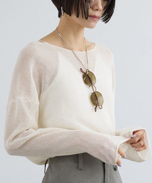 オーガニックリネン100%。涼しく着映える大人のシアーボートネックプルオーバー ■デザイン/シルエット 素材の上質さを活かしたミニマルなボートネックプルオーバー。 広めの天幅がデコルテを美しく見せ、両サイドのスリットが抜け感と女性らしさを演出します。 ヒップが隠れるゆったりシルエットで体型カバーも叶えつつ、程よいシアー感で軽やかな印象に。 肌離れの良いドライタッチで、真夏も快適に着用できるサマーニットです。 ■素材 オーガニックリネン100%糸を使用したエコ素材のニット。 ナチュラルすぎない程よい艶感とハリ感があり、上品でクリーンな表情に仕上げました。 通気性に優れ、さらりとした着心地で暑い季節も涼しく快適に過ごせます。 ■コーディネート シルクパンツやスラックスと合わせたきれいめコーデから、 デニムとの大人カジュアルまで幅広く対応。オンオフ問わず活躍する万能トップスです。 ■オーガニックリネンシアーシリーズ一覧 ・商品番号:SHM36210 商品名:オーガニックリネンシアーボートネックプルオーバー ・商品番号:SHK36210 商品名:オーガニックリネンシアークロップドカーディガン ■モデル身長:166cm 着用サイズ:F ----------------------------- 裏地:なし 光沢感:なし 透け感:あり 伸縮性:あり 生地の厚さ:ふつう -----------------------------