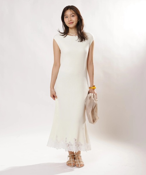 裾にあしらった繊細なレースが足元を華やかに彩るニットワンピース。 すっきりとしたIラインシルエットが大人の上品さを引き立て、伸縮性のあるリブ素材で着心地も快適です。 一枚でエレガントに着こなすのはもちろん、シアーシャツやカーディガンを羽織って軽やかに、スニーカー合わせでカジュアルダウンしたスタイルも楽しめる一着です。 【ご注意】 ※撮影照明の関係により、実際の商品と色味が異なって見える場合がございます。 また、パソコン・スマートフォンなどの環境により、製品と画像のカラーが異なる場合もございます。 予めご了承ください。 ※商品画像はサンプルのため、色味やサイズ等の仕様に変更がある場合がございますので、予めご了承ください。