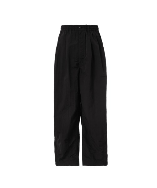 太目のシルエットにパッカリングによるピリピリとした独特のステッチが加わったパンツは生地にナイロンタッサーを使用したライトな素材感が魅力となった一本。マットでドライタッチな質感でありながら撥水性に優れた高機能な生地感が魅力です。パンツに使用されるデザインはウエストがドローコード仕様となるイージーパンツでありながらも2タックでゆったりとしたボリューム感のあるウエストと渡りから裾に向けてダーツを加える事でキュっとテーパードを加えたオリジナルシルエット。太いシルエットながらも裾を独自のテーパードデザインを加える事で太いながらもスッキリとした印象を与えてくれるコム デ ギャルソン・オムならではのパンツです。 These pants feature a wide silhouette and unique, crisp stitching created by puckering, and are made from a lightweight nylon taffeta fabric, making them an appealing choice. The fabric has a matte, dry texture and is highly functional with excellent water repellency. The design of the pants is easy-fitting with a drawcord waist, but features two pleats for a relaxed, voluminous waist and darts from the thighs to the hem for an original tapered silhouette. Despite their wide silhouette, the unique tapered design at the hem gives them a slim, yet sleek look, a style unique to Comme des Garçons Homme.