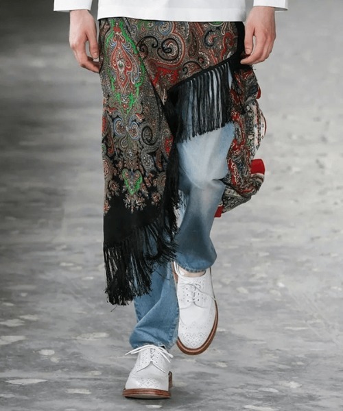 「Levi's(リーバイス)」とのコラボレーションデニムは、5ポケットのインディゴデニムにユーズド加工が加え、全体に入ったナチュラルな色落ちしたパンツにフリンジがアクセントのスカーフをドッキング。前後で表情の違うデザインとアンティーク調のスカーフ柄が特徴的なコラボレーションならではの特別なデニムです。 The collaboration denim with Levi's features five-pocket indigo denim with a distressed finish, naturally faded pants with a fringe accent scarf.The different designs on the front and back and the antique-style scarf pattern make this a special denim only possible through this collaboration.