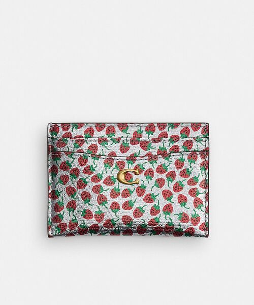 エッセンシャル カード ケース・ストロベリー プリント ・ フォイル メタリック レザー ・ カードスロット x 5 ・ 縦7.5cm x 横11cm キャッシュレス派にとって財布代わりにもなる、エッセンシャル カードケースです。 鮮やかないちごのプリントを施した、艶やかな光沢のあるフォイル メタリック レザーで作り上げました。コーチの“C”のハードウェアがアクセントを添えます。 どれくらい収納できますか? カードスロット4つに加え、中央のポケットにカードやキャッシュを収納可能です。 使い心地はどうですか? 下段スロットにカーブを設け、カードの出し入れがしやすい設計。スリムな形状で持ち運びにも便利です。 どんなスタイルに合いますか? 華やかなプリントが映えるデザインで、バッグの中のアクセントとしても楽しめます。 ※ご使用のパソコンやスマートフォンの画面設定や機種により実際のカラーと異なって見える場合がございます。 ※カラー名は管理用の表記であり、タグの表記と異なっております。 【COACHについて】1941年にニューヨークで創立したグローバルファッションブランドです。美しさと機能性を兼ね備えたコーチ製品には、熟練したクラフトマンシップが細部にまでに行き届き、最高の使い心地とスタイルをお届けします。ジェンダーレスに使えるデザインも豊富に揃え、ギフトでもたくさんのお客様にお選びいただいています。クリエイティブ・ディレクターのスチュアート・ヴィヴァースのビジョンと、私たちのホームタウンであるニューヨークの、誰をも受け入れる姿勢(インクルーシブ)、そして勇気ある精神にインスパイアされ、誰もが自分らしくいられるように、永く愛される美しいものづくりを行います。