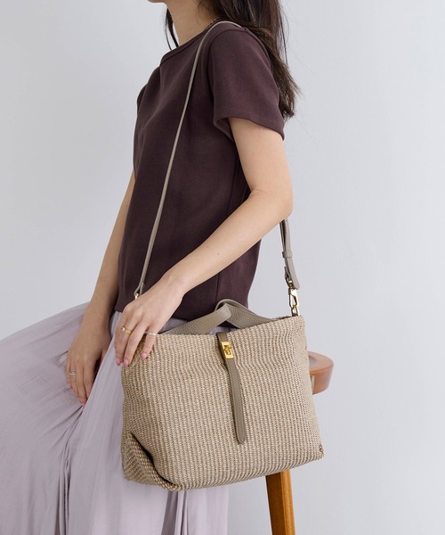 上品な風合いが魅力のラフィア調シートを使用したトートバッグ。 柔かい雰囲気とさりげない金具使いがポイントになったデザインです。 長財布やのペットボトルが収納でき、使い勝手も抜群。 付属のショルダーストラップを使って斜めがけもできるので、幅広いシーンでお使いいただけます。 【fabric】 ナチュラルな風合いを表現しつつ、綿の柔らかさとナイロンの軽さ、耐久性を兼ね備えた扱いやすい素材感。 立体的な編み地がシーズンムードを高め、軽やかさの中にも程よい存在感をプラスします。 【coordinate】 カジュアルにもきれいめにも馴染む、抜け感のある大人スタイルに。 合わせるだけで季節感を一気に高めてくれるアイテムです。 メーカー品番:V-8744 メーカー表記カラー S/BEIGE:SAND BEIGE(TAUPE) BROWN:BROWN(BROWN) ※こちらの商品は、天然素材を使用している為、サイズや色合いに個体差が生じる場合がございます。ご了承ください。 *内側:ポケット×2 -------------------------------------- 【VIOLAd’ORO / ヴィオラドーロ】 バッグブランド「VIOLAd’ORO(ヴィオラドーロ)」。 イタリア語でVIOLAは紫、OROは金。 ブランド名の由来は、デザイナーがイタリア在住時にプレゼントされた1940年代の紫と金の掛け時計。 持つごとに愛着が湧き、大切に扱われる、そして自分のスタイルに欠かせないもの。 そんな存在であってほしいという願いを込めながら、上質でトラディショナルななかにも旬のエッセンスを織り交ぜた デザインを発信している。 -------------------------------------- ※商品画像はできる限り実物の色に近づけるよう徹底しておりますが、お使いのデバイスのモニター設定、お部屋の照明等の閲覧環境により実際の色味と異なって見える場合がございます。 ※画像の商品はサンプルです。実際の商品と仕様、加工が若干異なる場合があります。予めご了承くださいませ。 ▼商品のお気に入り登録 お気に入りアイテムの値下げ・再入荷・在庫1点などの通知を受け取ることができます。 ▼ブランドのお気に入り登録 新商品や再入荷、クーポン配布などのお得な情報を受け取ることができます。