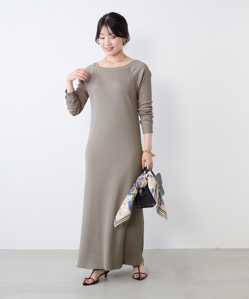 大人の抜け感を演出するカットソーワンピース。 広めのネックラインが特徴で、程よくゆとりがありながらも女性らしいIラインシルエットに仕上げました。 ラグランスリーブやセンターバックにはステッチワークを施し、きれいめすぎずカジュアルすぎない絶妙なバランスで仕上げた一枚です。 【fabric】 コットンポリエステルのテレコ素材を使用しています。 キックバックも良く程よい肉感があるので、身体のラインを拾いにくく、柔らかな肌触りなので着心地の良い素材です。 -------------------------------------- 透け感:なし 裏地:なし 伸縮性:あり 光沢感:なし 生地の厚さ:普通 --------------------------------------水洗い可 *詳しくは商品の洗濯表示にてご確認をお願い致します。 【coordinate】 アウターや小物をプラスして春らしい抜け感を演出するのがおすすめ。 デニムシャツを羽織ることでカジュアルでアクティブな印象に。 ジャケット合わせでは大人の洗練された着こなしをお楽しみいただけます。 腰回りが気になる方は、シャツを腰巻きにしてテクニックのあるスタイルを。 ロング丈なのでスニーカーやヒールなどの足元のアイテムにも困りません。 ※こちらの商品は直営店舗での展開はございません。 ※商品画像はできる限り実物の色に近づけるよう徹底しておりますが、お使いのデバイスのモニター設定、お部屋の照明等の閲覧環境により実際の色味と異なって見える場合がございます。 ※画像の商品はサンプルです。実際の商品と仕様、加工が若干異なる場合があります。予めご了承くださいませ。 ▼商品のお気に入り登録 お気に入りアイテムの値下げ・再入荷・在庫1点などの通知を受け取ることができます。 ▼ブランドのお気に入り登録 新商品や再入荷、クーポン配布などのお得な情報を受け取ることができます。