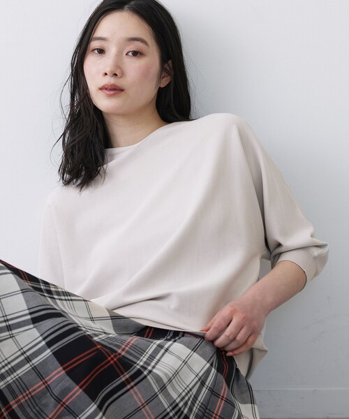 【デザインポイント】 浅めのVネックが顔まわりにほどよい抜け感を与える、大人にちょうどいいニットトップス。 背中にはくるみボタンをあしらい、後ろ姿までさりげなく印象に残るデザインです。 身頃は程よくゆとりのあるシルエットで、身体のラインを拾いにくく安心感のある着心地。 ラグランスリーブ仕様のため、肩まわりが動かしやすく、リラックス感がありながらもきれい見えを叶えます。 袖口と裾はリブ切り替えで、自然にブラウジングできるのもポイントです。 【スタイリングポイント】 ワイドパンツや落ち感のあるスカートなど、ボリュームのあるボトムと合わせることで今年らしいバランスに。 1枚着としてはもちろん、インナーを入れたレイヤードや、ジャケットのインにも使いやすく、きれいめからデイリーまで幅広く活躍します。 【素材ポイント】 ★CIRCRIC★ コットンレーヨンの糸を強く撚糸することで、ナチュラルなタッチと清涼感を持たせた素材です。 さらりとしたナチュラルな肌触りと清涼感があり、ロングシーズン快適に着用いただけます。 レーヨンはLenzing社のエコベロを使用しており、植物由来の原料を使用することで二酸化炭素削減に貢献しています。 ※照明の関係により、実際よりも色味が違って見える場合があります。また、パソコン・スマートフォンなどの環境により、若干製品と画像のカラーが異なる場合もございます。 モデル情報:身長168cm B80 W61 H88 着用サイズ:02(M) 店舗へのお問い合わせ商品番号:F58-15402 ●製品寸法: 00(XS):着丈52cm B102cm 裄丈56cm 01(S):着丈53cm B106cm 裄丈58cm 02(M):着丈55cm B110cm 裄丈60cm 03(L):着丈57cm B114cm 裄丈63cm 備考: