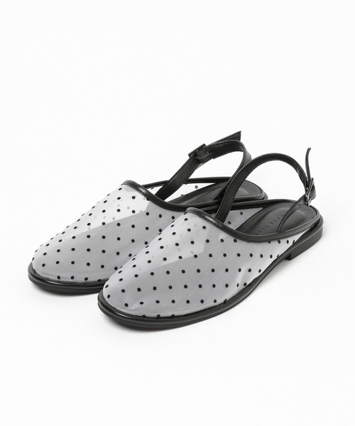 ■デザイン■ 甲材に絶妙な透け感のあるチュールを使用したミュールになります。 ドットのフロッキ―プリントもポイントで甘いスタイリングにもばっちりです。 春先から秋まで着用できるあると便利な1足です。