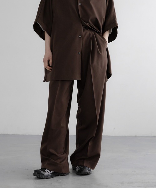 ■素材 メランジ感のある表面感と程よい肉感があり綺麗な表情の素材です。 ストレッチ性があり履きやすく、ピリングしにくいイージーケアなどの機能性もポイントです。 ■デザイン ワイドストレートシルエットのトラウザーです。 後ウエストベルトはイージー仕様にしているため、幅広い体型の方にお楽しみいただけます。 ボリュームのあるシルエットなので、シンプルなスタイリングにも程よいアクセントになります。 また、カジュアルなフーディやスウェットなどと合わせていただくのもお勧めな一着です。