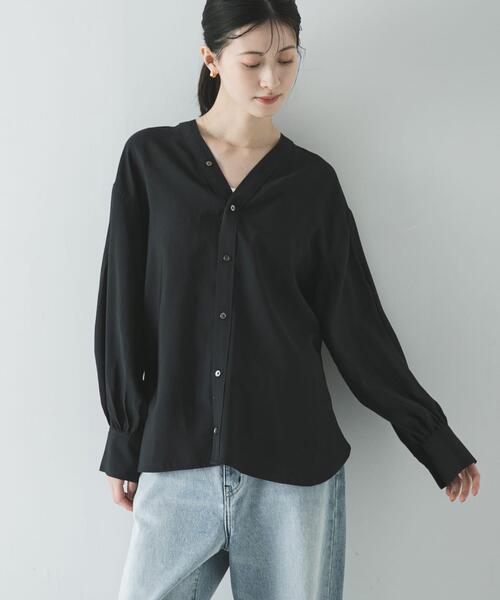 Vネックが端正な抜け感を与え、オンオフ問わず軽やかに着回せるネックブラウス。 アーバンリサーチで好評だったアイテムが、さらにバランスの取りやすい着丈にアップデートして登場しました。シルク特有のしなやかさにアセテートやレーヨンを掛け合わせることで、美しい落ち感がありつつも、さらりとした快適な肌触りが魅力です。 程よくルーズなシルエットとデコルテがきれいに見える絶妙なVネックが、装いに女性らしいニュアンスをプラスします。 シンプルなデザインは合わせるアイテムを選ばず、デイリーからオフィススタイルまで幅広く活躍。前開き仕様なので、一枚着としてはもちろん、季節の変わり目の羽織りとしても重宝する万能な一着です。 POINT ・顔まわりをすっきりと見せ、程よい抜け感を添える前後のVネックデザイン ・シルク混ならではの滑らかな肌触りと上品な落ち感 ・オンオフ着回し力の高いデザイン 【2026 Spring/Summer】【26SS】 ※この商品は素材の性質上、水分や汗、摩擦(特に湿った状態での摩擦)により、他の物に色移りすることがありますのでご注意ください。 ※商品画像は、光の当たり具合やパソコンなどの閲覧環境により、実際の色味と異なって見える場合がございます。予めご了承ください。 ※商品の色味の目安は、商品単体の画像をご参照ください。 ▼お気に入り登録のおすすめ▼ お気に入り登録された商品は、マイページにて現在の価格情報や在庫状況の確認が可能です。 お買い物リストの管理にぜひご利用ください。 素材感 透け感 : ややあり(OFF WHITE, SAX) 伸縮性 : なし 裏地 : なし 光沢 : なし ポケット : なし Free