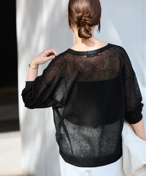麻とポリエステルを組み合わせ、細番手の糸で繊細に編み立てたシアー素材のVネックプルオーバー。 ドライで清涼感のあるタッチとしっかりとしたハリが特徴で、シワになりにくくイージーケアなのも嬉しいポイントです。 縦長のVネックが甘さを抑え、シックで大人な印象に。 ゆったりとしたシルエットに前後差をつけることで、自然な抜け感を演出します。 春夏のレイヤードスタイルにぴったりの一着です。 ********************** 透け感:あり 裏地:なし 伸縮性:あり 光沢感:なし 生地の厚さ:薄手 ********************** ※取り扱いについては、商品についている品質表示でご確認ください。 ※こちらの商品は、FRAMeWORK での取り扱いになります。 直接店舗へお問い合わせの際は FRAMeWORK 店舗へお願い致します。 ※照明の関係により、実際よりも色味が違って見える場合があります。 またパソコン・スマートフォンなどの環境により、若干製品と画像のカラーが異なる場合もございます。 予めご了承の上ご注文ください。 ※商品の色味は、商品アップ画像をご参照ください。 本体:手洗い可能