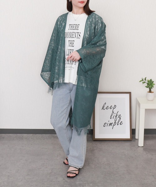 「重ねて、華やぐ」 繊細な総レースが羽織るだけで華やかさをプラス。 ストール風カーディガンが新登場。 ■point 繊細なレースと裾のフリンジが、他と被らない華やかさを演出。 さっと羽織るだけで、シンプルなコーディネートに華やかさをプラスします。 前後差のあるロングシルエットで、 抜け感と上品さを兼ね備えた大人のための羽織りアイテムです。 体のラインを拾いにくいゆったりシルエットも嬉しいポイント。 きれいめからカジュアル、和装まで幅広く合わせていただけます。 ■detail ・総レース仕様の軽やかな素材感 ・裾はフリンジデザインでアクセントをプラス ・後ろ丈はふくらはぎあたりまでのロング丈 ・袖は手首がすっぽり隠れる長め丈 ・後ろネックラインはVネック仕様で、背中もすっきり見え ・ゆったりとしたドレープシルエットで自然な体型カバー ■fabric さらりとしたタッチが爽やかな、レース素材。 軽量で柔らかな素材感なので、季節を問わず使いやすいアイテムです。 …………………… 透け感:あり 厚さ:普通 裏地:なし 光沢感:なし 伸縮性:なし ポケット:なし 洗濯方法:手洗い・ドライクリーニング・ウェットクリーニング …………………… ※ネットに入れてのお洗濯をお勧めいたします。 ※詳しいお手入れ方法は商品タグをご参照ください。 ■coordinate シンプルなTシャツ×デニムにさっと羽織るだけで、上品な大人カジュアルに。 総レースの透け感が軽やかさをプラスします。 Iラインワンピースに重ねて、縦長シルエットを強調。 裾フリンジが動くたびに華やかさを演出します。 フィット感のあるトップスときれいめワイドパンツに合わせれば、上品なオフィスカジュアルに。 ロング丈で体型カバーしながら、洗練された印象に仕上がります。 ■wearing scene ショッピング 散歩 リゾート 通勤 オフィスカジュアル ランチ会 女子会 和装 ------------------------------ レース カーデ カーディガン 羽織り トップス レディース ストール ショール フリンジ きれいめ 冷房対策 ------------------------------ 《商品のお気に入り登録》 ・再入荷通知や、ラスト1点の通知、セール通知も受け取ることができます。 《ブランドのお気に入り登録》 ・新商品や再入荷など、お得な情報を受け取ることができます。 ※屋外の光や照明の当たり具合、パソコンなどの閲覧環境によって実際の色味と異なって見える場合がございます。 予めご了承ください。 ※他のキャンペーンにより、期間中に価格が変動する場合があります。 ※ご注文いただいた予約商品のお届け時期の確認は、注文履歴ページより行えます。 【2026 Spring/Summer】【2026SS】【26SS】