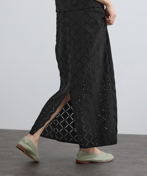 ■デザイン/シルエット 素材の表情を活かしたシンプルなナローシルエットスカート。 すっきり見えを叶える内側ゴム仕様で、快適な穿き心地ときれいなウエストラインを両立します。 バックスリット入りで足さばきも良く、ストレッチ性もありストレスフリー。 暑い季節でも楽に着映えが叶い、ロングシーズン活躍する一枚です。 ■素材 1950年創業、イタリア・プラトーの老舗テキスタイルメーカーcafissi社のジャージーファブリックを使用。ダイヤ柄をベースに、アイレットやコントラストを効かせた立体感のある表面が特徴。 遊び心と高級感を兼ね備えたイタリア素材です。 ■コーディネート 同素材のノースリーブプルオーバーとのセットアップはもちろん、 ロゴTやプリントTと合わせた大人カジュアルな着こなしもおすすめです。 ■Cafissiダイヤパターンシリーズ一覧 ・商品番号:SHM36240 商品名:Cafissiダイヤパターンチョーカー付きノースリーブ ・商品番号:SHC36240 商品名:Cafissiダイヤパターンスカート ■モデル身長:166cm 着用サイズ:F ----------------------------- 裏地:あり 光沢感:ややあり 透け感:あり ポケット:なし 伸縮性:あり 生地の厚さ:ふつう -----------------------------