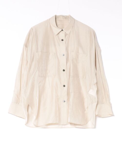 オーバーサイズでメンズライクなシルエットながら、 ポケットディテールや衿の抜け感にこだわった大人のシャツ。 【デザイン/コーディネート提案コメント】 カジュアルすぎない洗練された一枚はオフィスシーンにも最適。 一枚でももちろん、羽織りとして暑い時期まで長く活躍する一着です。 【素材/お手入れコメント】 程よいハリ感とシルク混ならではの上質なツヤが魅力のシアー素材。 軽やかな透け感で、春夏のスタイリングに抜け感をプラスします。 ご自宅で手洗いできるイージーケアも嬉しいポイント。 上品さと扱いやすさを兼ね備えた、デイリーに取り入れやすい素材です。 ■透け感 ややあり ■伸縮性 なし ■光沢感 なし ■裏地 なし ■生地の厚さ 薄い