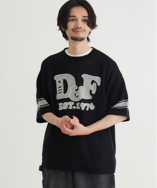 Tシャツより「ちゃんとして見える」大人のサマーニット。レトロなロゴとジャガードの立体感で、一枚で主役になる洗練デザイン。 【仕様】 糸を編み込んだジャガードでロゴを表現した本格仕様。 ドロップショルダーのリラックスシルエットと、襟元・袖口の配色リブ&ラインがスポーティなアクセントに。 ブラックは背面メッセージ入りなどカラーごとに表情が異なり、1枚で着映えする設計です。 素肌に直接着られる軽さと上品さを両立しています。 【素材感】 滑らかでチクチク感の少ないニット素材を使用。 程よい厚みがありつつ通気性が良く、カットソー感覚で着られる軽やかさ。 ジャガードの凹凸が立体感と高級感を生み、伸縮性もあるため着心地は快適です。 【スタイリングイメージ】 デニムやチノで定番のアメカジに仕上げるのはもちろん、スラックス+革靴でハズしの大人コーデにも最適。 白Tをインナーにレイヤードして裾を覗かせるとこなれ感アップ。 夏はショーツ合わせでラフに、ジャケットのインナーとしてもきれいに収まります。 【おすすめポイント】 ・糸で表現するジャガードロゴが高級感を演出し、プリントの劣化を回避 ・配色リブ&ラインでスポーティかつ洒落たアクセントをプラス ・ドロップショルダーのリラックスシルエットで体型カバー&涼しげな見た目 【こんなシーンにおすすめ】 ・週末のカジュアル外出やカフェでのリラックスコーデに ・デニムやチノで作る定番アメカジを上品に見せたいときに ・スラックスと合わせた「大人のハズし」スタイルやレイヤードに ※着用はイメージになります。商品の色味は商品単体画像をご確認ください。 ーーーーーーーーーーーーーーーーーーーーーーーーーーーー お得に&便利にお買い物を楽しむポイント♪ ▶商品のお気に入り登録( ♥ハートマーク をクリック) お気に入りアイテムの完売カラーの再入荷通知や、 ラスト1点の通知、セールなどの情報をいち早くお届け。 ▶ショップ・ブランドのお気に入り登録 新商品や再入荷、クーポン配布などお得な情報を随時お届け。 ーーーーーーーーーーーーーーーーーーーーーーーーーーー
