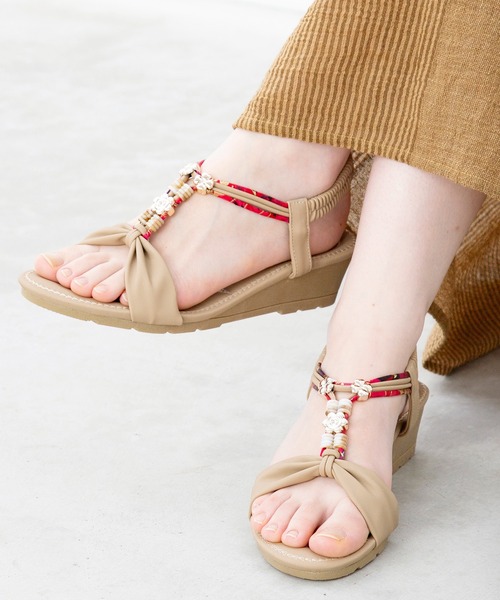 エキゾチックな柄や色合いのコードがアクセントになった、リゾート感あふれるウェッジソールサンダル。ふかふかのクッションインソール入り。 かかとストラップはゴム仕様でフィットしやすいデザイン。 カジュアルコーデやエスニックスタイルのアクセントに◎ ※サイズには個人差がございます。あくまで目安にお考えください。 ※こちらの商品は1点1点職人による手作りとなります。その為、生地の取り方により柄の配置や形・色合いなど若干異なる場合がございます。(画像は一例です。)あらかじめご了承ください。 Amina Collection Co.,LTD.