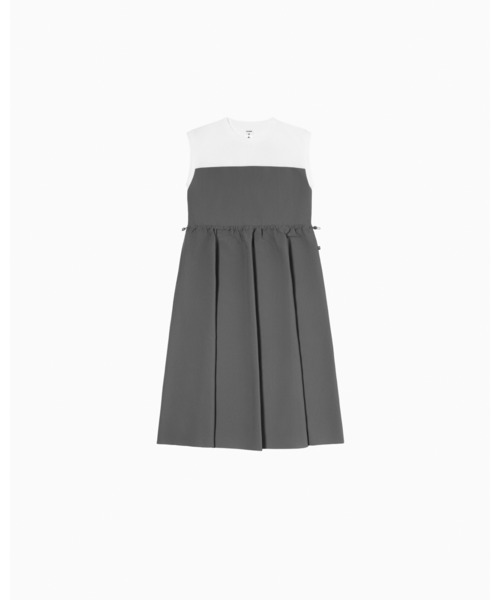 吸汗速乾、UVカット機能のある綿ポリエステル素材をベースに、ストレッチ性のあるシアサッカー素材を胸元からスカート部分に組みあわせた、異素材のドッキングワンピース。 後ろ部分にはプリントを施し、切り替えを入れてすきっりとした印象に。 ウエスト部分にはドローコードを付属し、絞り具合を変えられるデザイン。