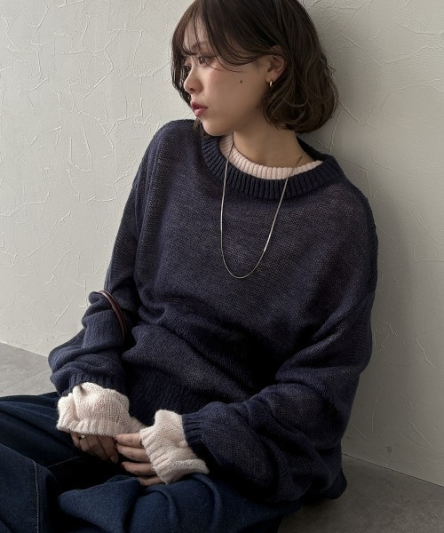 ふんわり纏う、大人のニュアンス。透け感を楽しむモヘア混シアーニット ■POINT ・柔らかなモヘア混素材で優しい肌当たり ・旬のシアー感でインナー次第に表情が変化 ・ざっくりとした編み地がこなれ感を演出 ・体型を拾わない、程よい落ち感シルエット ■商品特徴 トレンドの透け感を存分に楽しめる大人可愛いニットが登場 モヘア混の柔らかな風合いがカジュアルな中に上品さをプラス。 同色系のキャミソールを合わせれば上品な肌見せスタイルが即完成します。 ナロースカートでレディに、デニムでラフにと 幅広い着こなしにマッチする万能な一着です。 ■骨格別おすすめコーデ <ナチュラル> ゆったりしたサイズ感がフレーム感をカバー。 ワイドパンツと合わせて重心を下げることで 骨格を活かしたラフな洒落感が引き立ちます。 <ウェーブ> インナーにハイネックを重ねて首元に厚みを。 裾を前だけインして重心を上げれば 柔らかな素材感と曲線美がマッチします。 <ストレート> インナーにVネックのキャミを仕込み 縦のラインを強調。ナロースカートでIラインを作ると 着膨れせずスッキリ見えます。 ■スタッフ着用コメント 身長153cm/骨格ウェーブ(Mサイズ着用) お尻が隠れる丈感で安心感があります。 袖は手首がすっぽり隠れますが 手首にたまる感じが推しポイントです♪ <仕様> アクリル54%・ナイロン39%・毛7% ※照明の関係により、実際よりも色味が違って見える場合があります。 またパソコン・スマートフォンなどの環境により 若干製品と画像のカラーが異なる場合もございます。 あらかじめご了承のうえ、ご注文ください。 透け感:あり 生地の厚み:やや薄い 裏地:なし 季節:春・秋・初冬 シルエット:ゆったり <洗濯方法> 手洗い推奨・平干し ★お気に入り登録の案内 ・商品のお気に入り登録:再入荷 ・ラスト1点・セール通知 ・ブランドのお気に入り登録:新商品、再入荷、ショップ情報 ■キーワード シアーニット、モヘアニット、透け感、レイヤード、体型カバー、骨格別、カジュアル、きれいめ、春ニット、秋服、初冬、着回し、ゆったり、こなれ感、オーバーサイズ、ニュアンスカラー、大人女子、デート服、休日コーデ、インナー次第、ナロースカート、デニム、トレンド、ふわふわ、肌見せ、Vネック、クルーネック、抜け感、骨格ナチュラル、骨格ウェーブ、20代、30代、40代、きれいめカジュアル、きれかじ、オフィスカジュアル、キレカジ、セーター、トップス、ニット、ファッション、レディース、大人、大人カジュアル、春、通勤カジュアル