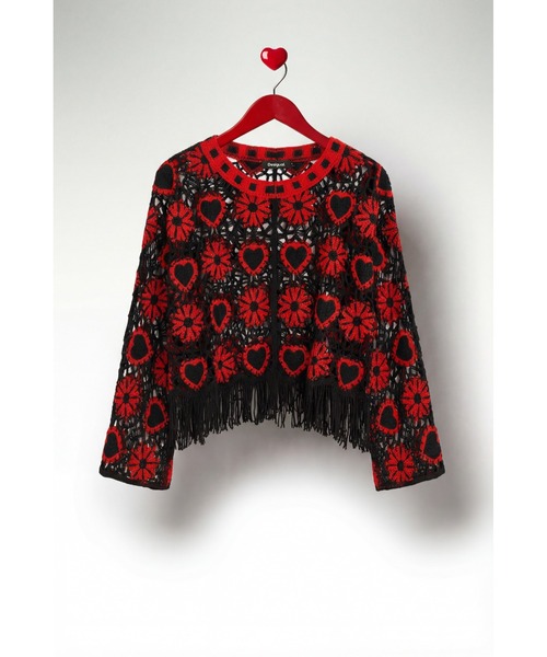 【ポイント】ブラックとレッドの大胆なコントラストで、ハートと花柄のモチーフを繰り返したかぎ針編みのセーター。 透かし編みならではの立体的なテクスチャーが、一枚でコーデの主役になる圧倒的な存在感を放ちます◎ 裾に施されたロングフリンジが動くたびに揺れ、ボヘミアンとモードを融合させた唯一無二の世界観を演出します★ クルーネックとワイドカフのクラシックなシルエットが、インパクトのある柄をバランスよくまとめています! 着るだけでスタイリングが完成する、Desigualの個性とアートを体現したスペシャルな一枚です◎ 【スタイリング】 ブラックのタイトスカートやレザーパンツと合わせて、ニットの個性を最大限に引き立てたモードなスタイルがおすすめ! シンプルなデニムと合わせて、トップスを主役にしたカジュアルコーデも楽しめます◎ レッドのアクセサリーやバッグでカラーを拾えば、統一感のあるインパクトコーデが完成します★ ブーツやローファーを合わせて、ボヘミアンテイストのこなれたスタイリングに! ※ご利用の端末画面の設定により実際の商品と色味が異なる場合がございます。 【Desigual × Nicki Nicole】"BOYSLIE - Valentine Gift Collection" Instagramフォロワー約2,300万人。アーティストNicki Nicole起用のバレンタインコレクション。全世界の若者から支持を集める彼女の、自立と選択の視点から、現代における"愛"のあり方を大胆に表現。 【Desigual ZOZOTOWN お買い物ガイド】 ▼商品をお気に入り登録!♡をクリック! 完売商品の再入荷やラスト1点の通知、セール開始時にお知らせ! ▼"Desigual(デシグアル)"をお気に入りブランドに登録! 新商品や再入荷など、ブランド最新情報をいち早くお知らせ! ▼Pick up! 店舗取り置きサービスがスタートいたしました。 ご注文の商品を最短即日、お近くの店舗でお受け取りいただけます。 【Desigualデシグアル】 バルセロナ発のファッションブランド「Desigual(デシグアル)」は、スペイン語で"他とは違う"という意味を持つブランド名の通り、個性を大切にするメッセージを込めています。地中海をイメージしたカラフルな色使いやエキゾチックなパターンが特徴で、レディース・メンズ・キッズまで幅広く展開。自由で楽しく、カラフルで前向きな鮮やかなデザインで、本当の自分を表現できるファッションを提案しています。