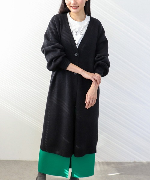 バルーン袖がさりげないアクセントのロングカーデ 程よくゆとりのあるシルエットで、体のラインを拾わずリラックスして着用できます。 Vネックデザインで、インナー次第できれいめにもカジュアルにも合わせやすいところも嬉しいポイント。 カラーは着回し力の高いブラックと、柔らかな印象のブラウンの2色展開。 軽さと伸縮性を兼ね備えていて、着心地も抜群です。 -------------------------------------- 透け感:なし 裏地:なし 伸縮性:あり ケア方法:手洗い可 ※お洗濯の際は洗濯表示を必ずご確認ください。 --------------------------------------