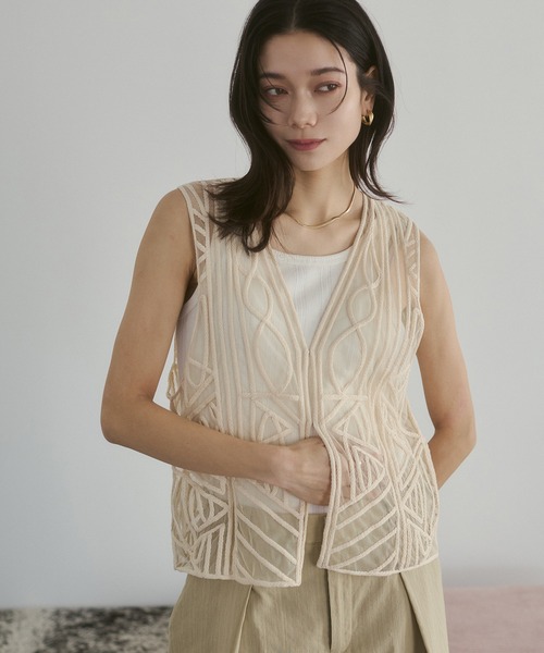 エンブロイダリーを施したベスト。 ■商品ポイント 幾何学をモチーフとした刺繍デザインは、程よい抜け感を与えてくれます。 ■素材 ネット素材に幾何学模様の刺繍を施しており、今っぽい雰囲気に仕上げています。※ATTENTION※・水洗いにより、縮み、型崩れ、風合い変化することがありますので、必ずドライクリーニングをしてください。・この製品は、インド製の生地を使用しています。ファッション性を重視した生地のため、1点1点の風合いや生地の見え方にばらつきが生じますが、生地の特長として予めご了承お願い致します。素材・繊維上引っ掛けが生じ易いので、着用・着脱の際、時計・アクセサリー・ベルト等の突起物に引っ掛からないよう注意して下さい。 ■コーディネート ジャケットの下にプラスワンアイテムとしての着用や、デニムと合わせて、カジュアルに着こなすのもおすすめ◎このアイテムを取り入れるだけで、ワンランク上の大人のスタイルに。 ------------------------------ 伸縮性:なし 透け感:あり 裏地:なし ------------------------------ ※お取り扱いについては、商品についている品質表示をご確認下さい。また、モニター・環境等で実際の商品と多少色が異なって表示される場合がございます。予めご了承下さい。 - 自分を甘やかす Bitterish clothes - DRESS FOR MYSELF おしゃれに悩まないストレスフリーなスタイルを福岡から提案いたします。 フレンチシックカジュアルをベーストレンドをデイリーに取り入れた気軽なウェア。 みんなの "ちょうどいい" 服づくりを目指しています。 ごきげんな自分に出会える予感。 kigocochi iicchan ne A-ne. ◆商品のお気に入り登録◆ 完売カラーの再入荷通知を受け取ることができます。ぜひご登録下さい。 ◆ブランドのお気に入り登録◆ 新商品や再入荷など、ブランドのお得情報を受け取ることができます。ぜひご登録下さい。 ※他のキャンペーンにより、期間中に価格が変動する場合があります。 ※セールは予告なく終了させていただく場合もあります。