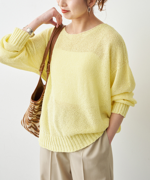 新色イエローが登場! 透明感のあるやさしい発色が、大人の装いに華やぎを添える新カラーが登場です。 色違いのナチュラル、ネイビー、ピンク、ブラックベースは、 別ページ《26080200556020》にて販売中です。ぜひお見逃しなく。 軽やかな着心地で支持を集める、涼感2WAYプルオーバー。 和紙を細くスリットさせて糸に撚りこむ事で通気性、吸水速乾性、軽さ、手洗い可能な夏に最適な日本で作られた糸を使用しています。 国内のホールガーメントの工場で編み立てているので、あたりやごろつきがないリラクシーな着心地です。 シャリ感のあるドライタッチな素材で適度な張りもあり、身体にまとわりづらく清涼感ある着心地が特徴。 ゆるっとした程よくオーバーなサイズ感で、インナー次第で幅広いレイヤードが楽しめます。 着丈をやや長くしたことで、よりテーパードやワイドパンツと好相性に。 フロントインすればバランス良くスタイルアップした着こなしにも。 リラクシーに着られる大人のカジュアルアイテムです。 ********************** 透け感:あり 裏地:なし 伸縮性:あり 光沢感:なし 生地の厚さ:普通 ********************** 【スタッフ着用コメント】 《スタッフS》 20代後半/身長:156cm/普通/普段サイズ:S/着用サイズ:フリー サイズ感:ゆったり着られますが、落ち感があって襟ぐりもすっきり開いていて華奢に見えるシルエットです。 素材感:シャリ感のある涼し気な素材。 着心地:さらっとした着心地で、程よく透け感もあって暑い日にも着られそう。 ********************** ※こちらの商品は 25080200543010、25080200543120、26080200556020 追加商品です。 ※色違いのナチュラル、ネイビー、ピンク、ブラックベースは26080200556020 にて販売中です。 ※追加生産商品は、一部の店舗や通販で販売されている場合がございます。あらかじめご了承ください。 ※同一商品でも個体差により、採寸サイズに若干の差が生じる場合がございます。 ※取り扱いについては、商品についている品質表示でご確認ください。 ※こちらの商品は、Spick & Spanでの取り扱いになります。直接店舗へお問い合わせの際は Spick & Span店舗へお願い致します。 ※照明の関係により、実際よりも色味が違って見える場合があります。 またパソコン・スマートフォンなどの環境により、若干製品と画像のカラーが異なる場合もございます。 ※商品の色味は、商品アップ画像をご参照ください。 着用スタッフ:160cm 着用サイズ:フリー 詳細着用スタッフ:163cm 着用サイズ:フリー 本体:手洗い可能