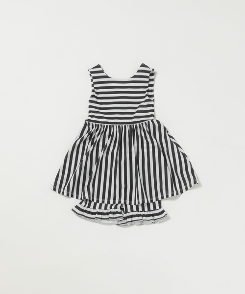 ■デザイン■ 今季イチオシのストライプセットアップSWIM。 ミニワンピースデザインで、細身のパンツとのセットアイテム! ワンピースからのぞくパンツのスソフリフリがポイントで、レトロ感がかわいいデザイン。 JUNIOR(140・150)もあるので、是非おともだちやご姉妹で着て頂きたいです♪
