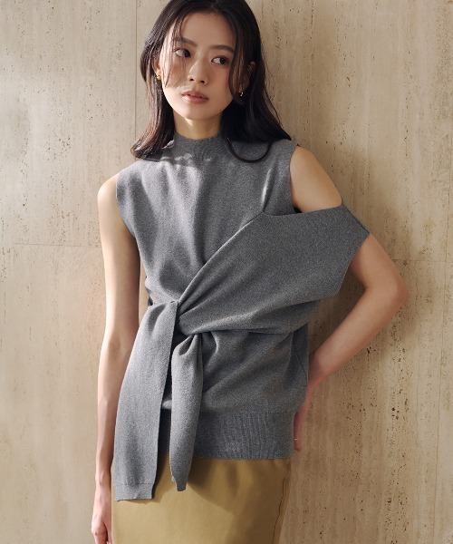 ニュアンス感のあるアシンメトリーなデザインが目を惹くニットトップス ■Design フロントで結ぶデザインが印象的なディフォメーションニットトップス。 肌見せを控えめに効かせることで上品さを保ちながらも印象的な佇まいに仕上げ、さりげなく女性らしさを引き立てます。 シンプルな中にデザイン性を効かせた1枚で、着るだけでおしゃれ感のあるスタイリングが完成します。 ■Fabric カシミア混のコットン素材を使用。 もちっとした肌に馴染む柔らかなニット素材です。 起毛感はないので通年ご着用いただけます。 ■Coordinate ミニマルながらも存在感があり、着丈を少し長めにお作りしているのでパンツにもスカートにも合わせやすいアイテムです。 フロントのディティールがアクセントになるのでジャケットのインナーにもおすすめです。 =================================== 裏地:なし 透け感:なし 光沢感:なし 伸縮:あり ケア方法:マシン ===================================