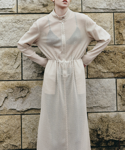 JOURNAL STANDARD 「La Maison de Lyllis」「LY」デザイナーのMIKA KASAIとジャーナルスタンダードのコラボ商品。 透け感のあるメッシュレース素材で仕立てたロングワンピース。 軽やかな編み地が風を通し、動きに合わせて涼しく揺れる一枚です。 首元はすっきりとしたスタンドカラーで、ミニマルな印象に。 ウエスト内側にはドローストリングコードを内蔵し、シルエットを絞って調整することができます。 身体のラインを拾いすぎないストレートシルエットとのバランスで、レイヤードによって表情が変化します。 フロントファスナーを下げて上半身を脱ぎ、腰に巻いてスカートのように着用するなど、スタイリングのアレンジも可能。 素材の軽さと構造の自由度が、着こなしに奥行きを与えます。 重ねる色や質感によって季節を問わず楽しめる、自由度の高いワンピースです。 【MIKA KASAI/ミカ カサイ】 La Maison de Lyllisデザイナー 葛西美歌。 文化服装学院アパレルデザイン科卒業後、各社帽子デザイナーを経て、La Maison de Lyllisを2014年にスタート。 同時に独学で木型を使用した昔ながらの手法での帽子製作を始める。 ディフュージョンラインとなるLYを2025年スタート。 帽子と洋服のバランス感に特に注力し、帽子単品の存在感の美しさとともに身につける人のアイコンとなるようなアイテムを提案している。 ※同シリーズで下記商品がございます。 26011410800010 別注【MIKA KASAI】hunting jacket 26030410800010 別注【MIKA KASAI】 Flare pants 26040410800010 別注【MIKA KASAI】Lace one-piece 26050410800010 別注【MIKA KASAI】chef shirt 26070410801010 別注【MIKA KASAI】 Rompers 26070410802010 別注【MIKA KASAI】 lace pants 26060410800010 別注【MIKA KASAI】Lace Skirt 26080410800010 別注【MIKA KASAI】Knit T-Shirt ※取り扱いについては、商品についている取扱表示にてご確認下さい。 ※照明の関係により、実際よりも色味が違って見える場合があります。 またパソコン・スマートフォンなどの環境により、若干製品と画像のカラーが異なる場合もございます。 ※商品の色味は、商品アップ画像をご参照ください。 本体:ドライクリーニング