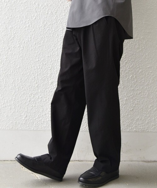 ストレッチ性抜群!程よくワイドなシルエットのテーパード型イージーパンツ 【素材特性】 高反発ストレッチ素材であるを使用したシアサッカー生地を使用。 ストレスフリーな着心地ながらも、伸びた分だけしっかりと戻るので型崩れしにくく、肘部分の飛び出しなどがしにくい素材です。 シアサッカー素材ですので軽量で肌離れが良く、少し暑い時期にも重宝します。 さらに撥水加工を施しているため、ちょっとした雨にも対応可能! ご家庭でのメンテナンスが可能なのも嬉しいポイントです◎ 【デザイン】 定番の2タックスラックスデザインの、セミワイドイージーパンツ。 前後両サイドにはポケットが配置されています。 ウエスト後ろ部分をシャーリング仕様にしている為、着脱し易いのが嬉しいポイント! セミワイドテーパードシルエットは様々なトップスに合わせやすいため、カットソーだけでなくシャツと合わせるのも◎ 同素材のGジャン型ブルゾンも展開しており、セットアップとしてもオススメのアイテムとなっています! 【同素材のトップスアイテム】 ◆〈撥水/軽量/ストレッチ〉SOLOTEX(R) シアサッカー トラック ブルゾン 26SS(セットアップ対応) 714-03-0012 ※モールサイトによって(ハイフン/-)抜きでの品番表記となります ---------------------------- 裏地:無 光沢感:無 生地の厚み:薄手 伸縮性:有 透け感:無 水洗い:洗濯機可 ---------------------------- 【注意事項】 ※末永く愛用頂く為に、アテンションタグ・洗濯ネームを必ずご確認の上、着用又はお取り扱いください。 ※撮影環境による光の当たり具合やパソコン・スマートフォンなどの閲覧環境によって、実際の色味と異なって見える場合があります。 商品の色味は商品単体で撮影した画像をご参照ください。 ※画像の商品はサンプルです。 実際の商品と仕様、加工、サイズが若干異なる場合がございます。