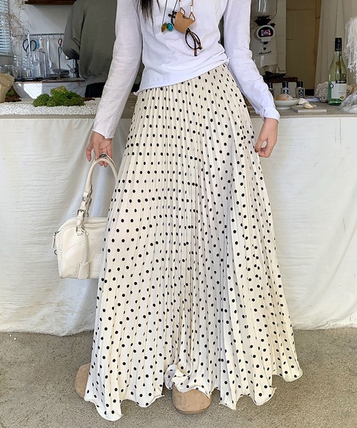 一枚で華やか、フェミニンなドットロングスカートが登場。 ■デザイン 細かなドット柄を施した、軽やかに揺れるプリーツロングスカート。 縦ラインを強調するプリーツ加工で、歩くたびに美しいドレープが生まれるデザイン。 ウエストは総ゴム仕様で、ラクに穿けるのにすっきり見えるシルエット。 シンプルなトップスと合わせるだけで、上品で女性らしいスタイルが完成する一枚。 ■素材 - 軽くて柔らかい素材で、動きに合わせてふわっと揺れる。 - プリーツがきれいに出る、程よいハリと落ち感のある生地。 - シーズンレスで使いやすい軽やかな素材感。 ■スタイル - 白トップスと合わせて、清潔感のあるフェミニンコーデに。 - Tシャツ合わせでカジュアルダウンしても可愛い。 - ニットやカーディガンと合わせて季節を問わず着回せる。 - パンプスやサンダルで上品に、スニーカーで抜け感をプラス。 ---------------- 透け感:ややあり 伸縮性:なし 裏地:なし ---------------- ------------------------------------ 【スタッフが着用しました!】 身長:158cm 普段着用サイズ:S~Mサイズ 今回着用サイズ:FREEサイズ ■ 着用感 - ウエストゴムでストレスフリー、長時間穿いても快適。 - プリーツの縦ラインで、自然にすっきり細見え。 - 軽い素材で動きやすく、歩くたびに揺れるシルエットが気分を上げてくれる。 - 体型を拾わず、誰でもバランスよく穿ける万能スカート。 ------------------------------------ 【お買い物をよりお楽しみいただく為に】 ▼お気に入り登録 サイズ・カラーを指定して、♡マークをクリック![セール通知・ラスト1点の通知・完売アイテムの再入荷通知]を受け取ることができます。 ▼ブランドのお気に入り登録 新商品や再入荷、タイムセールやクーポン等いち早くブランドのお得な情報を受け取ることができます。 ------------------------------- ※取り扱い上のご注意 染色の特性上、発汗や摩擦により色落ちしたり他のものに色移りすることがありますのでご注意ください。 韓国ファッション オフィスカジュアル ガーリー 大人カジュアル