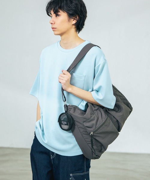 フロントに配したポケットがアクセントになったショルダーバッグ。 サイドポケットや内ポケットもあり、収納力も抜群です。 程よいサイズ感でデイリー使いはもちろん、トラベルシーンにもお使いいただけるアイテム。 ナイロンの軽い素材とワイドなショルダー紐で、肩への負担が少ないのも嬉しいポイント。