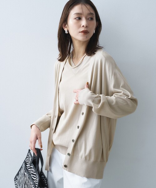 【デザイン】 シャープな印象のVネックカーディガンはフロントボタンの仕様で着こなしの幅が広がるのが魅力。 ゆったりとしたシルエットがこなれ感をプラスし、袖口や裾のリブ仕様が全体を引き締めるアクセントになっています。 羽織るだけで軽やかな印象を与え、18G天竺素材の繊細な光沢感が日常使いにも上品さを添えます。 シンプルなアイテムだからこそ、細部へのこだわりが光るデザインです。 同素材のプルオーバーの展開有り。 【素材感】 インド原産の細番手の綿糸にナイロンを撚り合わせた、さらっとした質感と繊細なシアー感が特徴の素材。 【着こなしポイント】 無地のタンクトップや薄手のブラウスをインナーに合わせて、優しいレイヤードスタイルがおすすめ。 全体のシンプルさを活かし、ボトムにはオーセンティックな柄や明るめのカラーを採用して軽快な印象に。 同素材のプルオーバーとアンサンブルの着こなしにはボトムに上品なスラックスをチョイスすると、オフィスにも映えるエレガントなスタイルに。 カジュアルに振るなら、デニムとスニーカーを合わせ、きちんと感と抜け感を絶妙に両立させて小物でカラーアクセントを取り入れてみても◎。 ※照明の関係により、実際よりも色味が違って見える場合があります。また、パソコン・スマートフォンなどの環境により、若干製品と画像のカラーが異なる場合もございます。 モデル情報:身長163cm B80 W59 H82 着用サイズ:02(M) 店舗へのお問い合わせ商品番号:153-35467 ●製品寸法: 00(XS):着丈61cm B96cm 裄丈75cm 02(M):着丈66cm B106cm 裄丈79cm 04(2LT):着丈70cm B112cm 裄丈81cm 44(3L):着丈69cm B120cm 裄丈81cm 48(5L):着丈69cm B128cm 裄丈82cm 備考:
