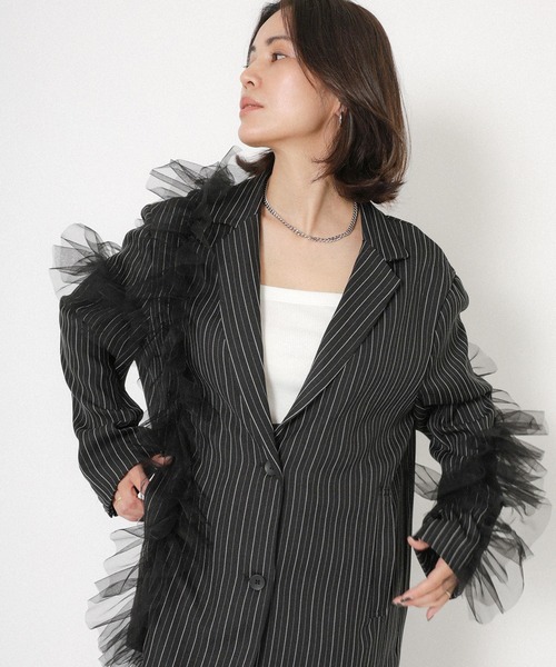【Floran ストライプ チュールシャツジャケット】 \ストライプに、チュールの立体感/ 遊び心を忘れないチュールシャツジャケット ■Styling チュールフリル×ストライプが印象的なテーラード風シャツジャケットが登場しました。 シャープなストライプ柄に袖からサイドへ流れるように重ねたチュールが奥行きを作り シンプルなスタイリングでも表情が出る一枚です。 きちんと見える襟デザインでカジュアルに合わせてもラフになりすぎず 一方でチュールの柔らかなニュアンスがかたさを和らげてくれるバランス感◎ ジャケットほど堅くなく、シャツ感覚で取り入れやすいので デニム、スラックス、スカートまで合わせるボトムを選びません。 スタイリングは ●デニム合わせ カジュアルの中にチュールのニュアンスが効くバランス インナーは白Tやタンクでミニマルにまとめるのがオススメ。 ●スラックス合わせ ストライプのきちんと感が活きる組み合わせ。 足元はローファーでクラシックにも、スニーカーで抜け感も◎ ●ナロースカート・タイトスカート合わせ 上半身に立体感がある分、ボトムはすっきりが好相性。 甘さを抑えた大人フェミニンに仕上がります。 ●ワンピースの上に ワンピの雰囲気を崩さず、程よく引き締めたいときに。 食事会などきれいめ寄りの日にも使いやすいスタイルです。 ベーシックは好き。でも少しだけ気分を変えたい そんな日に自然と伸びる存在感です。 ■Detail ・ストライプ柄のシャツジャケットデザイン ・テーラード風の襟で顔まわりをすっきり見せてくれる ・袖~サイドにチュールを重ねた立体フリル ・程よくゆとりのあるシルエットで重ね着しやすい ・甘さとモード感のバランスが取りやすいデザイン ※迷ったら インナーは無地、ボトムはシンプルが一番きれいにまとまります。 ■Material ・落ち感があり、ラインが綺麗にでる素材 ・軽さがありロングシーズン取り入れやすい ・ストレッチ性があり動きやすい ・チュールの立体感がスタイリングにニュアンスをプラス。 ▽生地感 透け感:あり 〇〇〇〇●なし 生地の厚さ:厚い 〇〇〇●〇 薄い 裏地:なし 伸縮性:あり ※この素材は摩擦(特に湿った状態での摩擦)や、汗や雨などでぬれた時は他の衣料や下着・バッグなどに色が移る場合がありますので、ご注意下さい。 ※繊細な素材を使用している為、引っ掛かりには十分お気をつけください。 ※洗濯の際は、他の物と一緒に洗わないでください。 ※濡れた状態で他の洗濯物を重ね合わさないでください。 ※漂白剤および漂白剤入りの洗剤のご使用はお避け下さい。 ※水洗いやクリーニングの際は、クリーニングネットを使用ください。また、つけおき洗いはお避けください。 ※商品の梱包には細心の注意を払っていますが、通販の特性上、到着時に畳みシワがついている可能性がございます。予めご了承ください。 ※詳しいお手入れ方法は商品タグをご参照ください。 ※この商品は、糸及び編組織の性質上、引っかけ・引っかかりやすい性質をもっております。着脱時には十分ご注意下さい。 【Information】 ◆《お気に入り登録》がオススメ◆ ・「商品のお気に入り登録」で再入荷通知や、ラストの通知、セール通知も受け取ることが出来ます。 ・「ブランドのお気に入り登録」で新商品や再入荷など、お得な情報を受け取ることが出来ます ※撮影時のライティング、太陽光、ご覧になっているモニター・PC環境により、実際の商品と色味が異なって見える場合がございます。予めご了承をお願い致します。