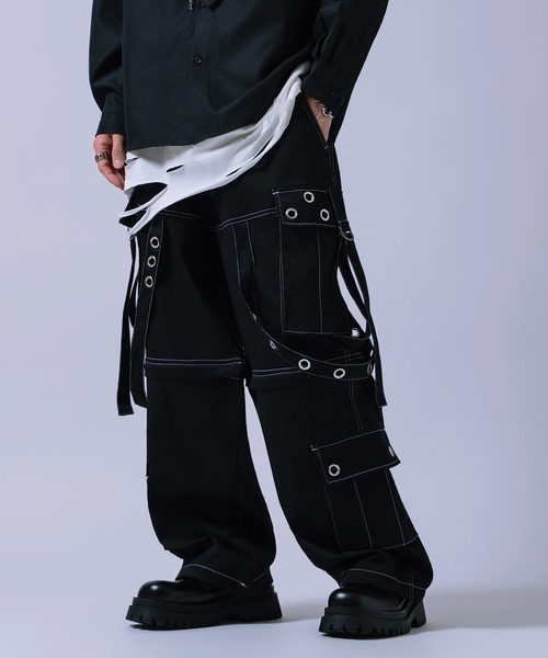 ギミックの極致。変幻自在のコンバーチブル カーゴパンツ ●スタイルや気温に合わせた自由な着こなしができる2WAYカーゴパンツ ●アイレットとロングストラップがパンク・ボンテージな雰囲気を演出 ●見た目の重厚感に反して軽量なポリエステル素材 ●どんなスタイルにも対応可能な2色展開 膝上のジップを切り離すことで、フルレングスからバギーショーツへ瞬時にチェンジ可能な2WAYカーゴパンツ。 厚底スニーカーやブーツを合わせた、海外ストリートを彷彿とさせるショーツスタイルや、 タイトなテック系アウターや、あえてオーバーサイズのフーディーを合わせたストリートなフルレングススタイルもおすすめ。 韓国ファッションと相性がよく、男女問わずユニセックスにお勧めしたいアイテムです。
