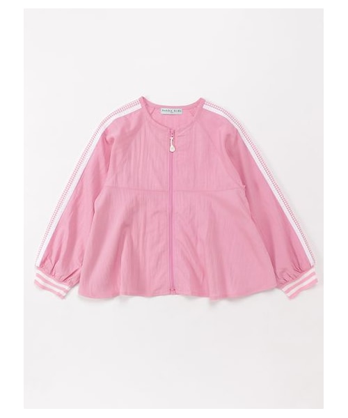 袖にあしらったチェックコンビのラインデザインやナイロン素材でスポーティーな雰囲気に仕上げたブルゾン。フレアシルエットやノーカラーでラフになりすぎず、女の子らしさもしっかりとトッピングしています。軽く羽織れるので堅苦しくなく着やすいのも魅力です。※画像と柄の位置が異なる場合がございます、ご了承下さい。