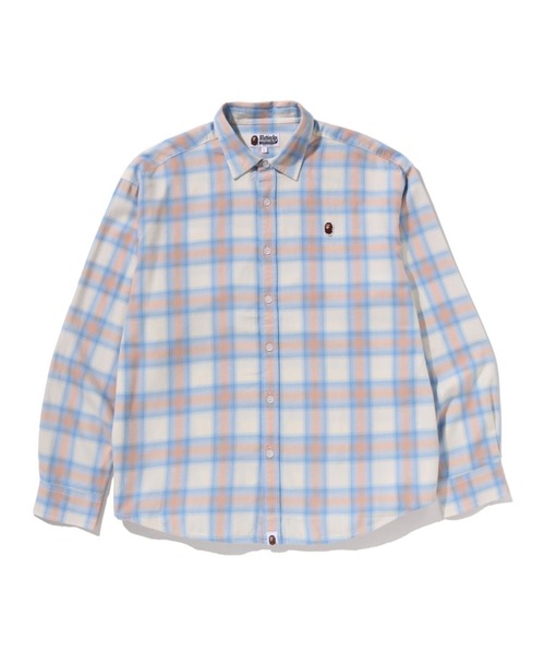 コットンを使用した着心地の良い、フランネルシャツ。 オンブレチェック柄で、左胸部分にAPE HEADのワンポイントワッペンをあしらったデザイン。