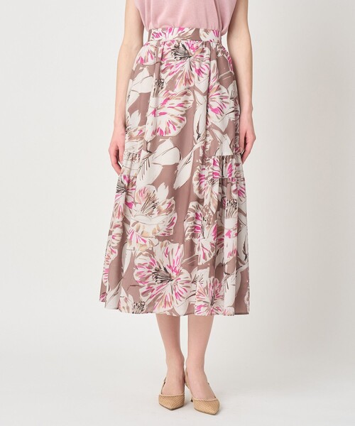 【Spring & Summer Collection 2026】 イタリアンインポートのペイントフラワープリント。 大き目なペイントタッチと華やかな色味が大人っぽい美しいプリントです。軽やかなローン素材にのせた生地は、春から夏にかけて涼しく、シワにもなりにくいのがポイント。 甘すぎないサイドティアードのギャザースカート。 ウエスト後ろはゴム仕様にしリラックス感のある着心地。 裾に向かってふんわり広がるフレアスカートに大胆なペイントフラワーのプリントをのせました。 シンプルなニットやカットソーと合わせてスタイリングの主役にしたい1枚です。 【付属】なし 【裏地】あり 【透け感】なし(プリント薄色の部分はややあり) 【開き・留め仕様】左ファスナー開き 【伸縮性】なし 【ケア方法】クリーニング 【着用感・生地の厚さ】薄地の軽やかなローン