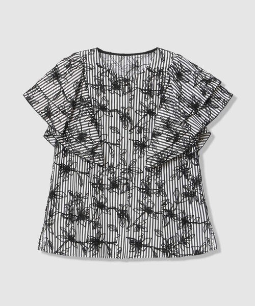【Spring & Summer Collection 2026】 美しい表面感の先染めストライプ地に、ANAYIオリジナルのフラワー刺繍を施しました。 ラインタッチのフラワー柄を、チェーンステッチで刺繍することにより立体感を生み出し他にはないスペシャルな素材。 ボリュームのある2枚重ねのラッフルスリーブがポイントのブラウス。 脇にスリットが入った仕様なので、ボトムスアウトで着用も可能。 1枚で存在感のあるブラウスは、シンプルなボトムスと合わせるだけで洗練された華やかさを演出できます。