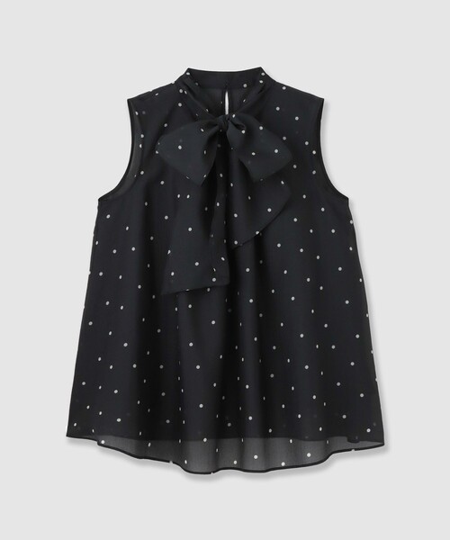 【Spring & Summer Collection 2026】 ワッシャー加工を施し表面に均一にシボを立たせた極薄の素材。 柔らかで軽やかな風合いが特長の生地にランダムドットプリントを施しました。 Aラインシルエットのリボンタイがエレガントなノースリーブブラウス。 リボンタイはお好みで前でも後ろでも結んでスタイリングして頂けます。 身頃のフロント衿ぐりにはタックを施しました。 パンツとアウトしたり、スカートインしたスタイリングがお勧めです。 シリーズのプリーツスカート(品番10261711250)とセットアップ着用でワンピース見えの着こなしも可能です。 【付属】キャミソール付き 【裏地】なし 【透け感】あり 【開き・留め仕様】後ろ釦開き 【伸縮性】なし 【ケア方法】ドライクリーニング 【着用感・生地の厚さ】細かいキレイ目なシボの表面感のオーガンジー