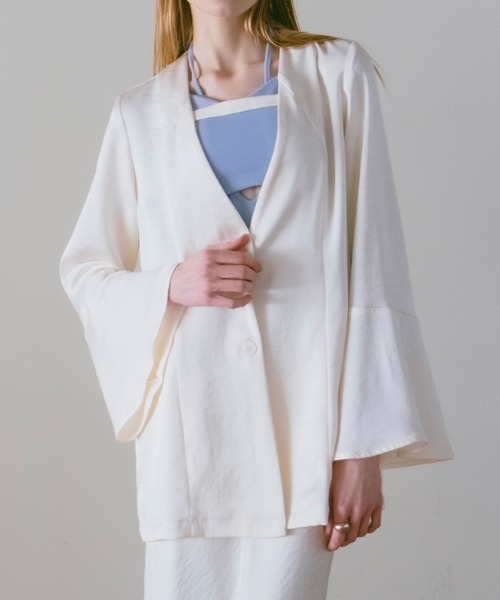 柔らかな光沢と上品なフレアスリーブが魅力のライトジャケット 控えめな光沢と、とろみのあるサテン生地を使用したノーカラージャケット。 Vネックの部分には取り外し可能な紐が付属しており、フロントデザインの表情の変化を楽しめます。 袖口にかけて広がるようにデザインされたフレアスリーブが、女性らしい柔らかさを演出。ゆったりとした着心地と、軽やかな着心地で、羽織としてもトップスとしても活躍する一枚です。 ◼︎Point ・柔らかい光沢のマットサテン。 ・とろみのある着心地。 ・春夏にぴったりの薄手の生地。 ・お呼ばれや結婚式にもおすすめ。 -------------------------------- 透け感 :なし 裏地 :あり 伸縮性 :なし 光沢感 :あり ポケット:あり -------------------------------- ※画像はサンプルを使用しているため実際にお届けする商品と仕様やサイズが異なる場合がございます。 ※照明の関係により実際よりも色味が違って見える場合があります。またパソコン・スマートフォンなどの環境により、若干製品と画像のカラーが異なる場合もございます。 ※実際のお色味は商品単品画像をご確認くださいませ。 ※商品によってはシワが付きやすく、畳み皺や折り皺が強く出る場合がございます。 洗濯表示や品質をご確認の上、アイロンまたはスチームアイロンをかけていただくことを推奨します。 ブランド品番:01-OT121-26-01 【sahara/サハラ】 遠い記憶、遥か異国の土地、文化、伝統。をコンセプトとし、現代に生きる女性に、ノスタルジックなリアルクローズを提案いたします。 ●商品のお気に入り登録 再入荷、残り1点、セールなどの通知を受け取ることが出来ます。 ●ブランドのお気に入り登録 新商品や再入荷、ショップのおすすめトピックスなど、いち早くブランドのお得な情報を受け取ることができます。