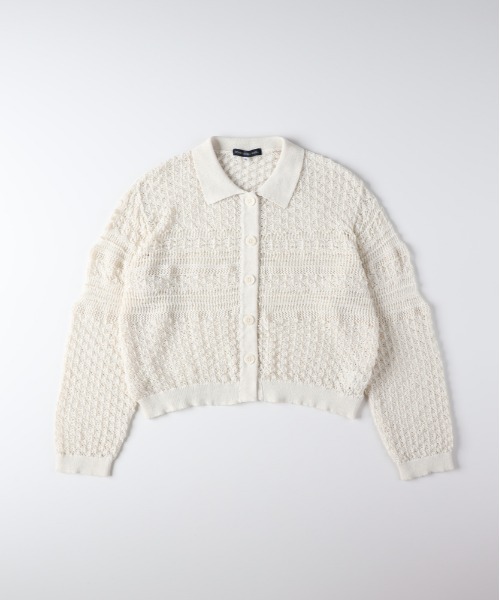 透け感のあるレース編みとポロ襟が奏でる、今どきのクラシカル&フェミニン。羽織るだけでこなれた大人の旬スタイルが完成します。 【仕様】 トレンドのポロ襟を備えたカーディガン仕様。 ボタンを閉めればトップスとして、開ければ軽い羽織りとして使える2WAYデザインです。 ドロップショルダーのリラックス感と、もたつかないショート丈でハイウエストボトムとの相性が良く、袖・裾のリブでシルエットにメリハリを付けています。 細部まで品のある仕上がりでオンオフ問わず活躍。 【素材感】 繊細なレース編みニットを採用した軽やかな素材感。 さらりとした肌触りで通気性が高く、暑い時期や冷房対策にも適しています。 程よい透け感は露出控えめで大人が着やすく、インナーの色で表情を変えて楽しめます。 季節の変わり目まで長く使えるジャストな厚みです。 【スタイリングイメージ】 コンパクトなトップスをタックインしてバックスタイルを強調するのが定番。 デニムでカジュアルダウン、フレアスカートやワイドパンツで女性らしいバランスに。 ボタンを全部閉めてプルオーバー風に着ればきれいめにも対応。 足元はヒールで洗練、スニーカーでデイリーにと幅広く着回せます。 【おすすめポイント】 ・ポロ襟×カーディガンの2WAY仕様で着こなしの幅が広い ・上品なレース編みの透け感でインナー次第で表情チェンジ可能 ・ショート丈でハイウエストボトムと合わせやすく、スタイルアップ効果 【こんなシーンにおすすめ】 ・オフィスのきれいめレイヤードや冷房対策としての羽織りに ・週末のカフェやランチなど大人のカジュアル外出に ・デートや夜のお出かけで程よく華やかさを出したいときに ※着用はイメージになります。商品の色味は商品単体画像をご確認ください。 ーーーーーーーーーーーーーーーーーーーーーーーーーーーー お得に&便利にお買い物を楽しむポイント♪ ▶商品のお気に入り登録( ♥ハートマーク をクリック) お気に入りアイテムの完売カラーの再入荷通知や、 ラスト1点の通知、セールなどの情報をいち早くお届け。 ▶ショップ・ブランドのお気に入り登録 新商品や再入荷、クーポン配布などお得な情報を随時お届け。 ーーーーーーーーーーーーーーーーーーーーーーーーーーーー
