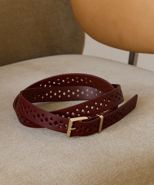 大小のダイヤ柄をパンチングで表現した、牛革のベルト。 レザーの重厚感とパンチングの軽やかさが調和し、スタイリングに絶妙な遊び心と奥行きを添えてくれます。 マニッシュなパンツスタイルから、ワンピースのフェミニンなウエストマークまで。 シンプルな装いに投入するだけで、旬のニュアンスを感じさせる洗練された着こなしを叶えます。 春夏ならではの軽快なアクセントを楽しめる、こだわりが詰まった一本です。 ※屋内外の光や照明の当たり具合で、実際の商品の色味とカラー別画像の色味に違いが発生する場合がございます。色味はスタジオ撮影の詳細画像にてご確認ください。 ※生地の寄り画像が最も実物に近い色味となります。 ーーーーーーーーーーーーーーーーーーーーーーー ▼ 商品のお気に入り登録 ▼ 完売カラーの再入荷通知や、ラスト1点の通知、 クーポン開始、セールの通知も受け取ることができます。 ▼ ブランドのお気に入り登録 ▼ 新商品や再入荷など、 ブランドのお得な情報をいち早くお知らせ! ぜひご登録ください!