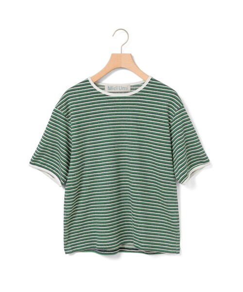 【Verkstedシリーズ】 自然なムラ感が特徴のマルチボーダープルオーバーです。2本の糸を編地の表と裏に分けて編むプレーティング技法でボーダーの天竺素材を使用。生地を重ねることで厚みがでて、透けづらい素材感となっています。首周りと袖口にボディと色違いの生地を輪状に補強したリンガーTのデザインが魅力的で、古着から着想を得たデザインです。袖口が少しふわっとなるギャザースリーブ仕立て。グリーンとレッドの2色展開で同シリーズ1-710111/マルチボーダープルオーバーL/Sも展開。 Point 袖丈:半そで デザイン:ボーダー ネック:クルーネック Detail 裏地:なし 透け感:なし 伸縮性:あり 光沢感:なし ポケット:なし ※商品画像は、光の当たり具合やパソコンなどの閲覧環境により、実際の色味と異なって見える場合がございます。予めご了承ください。 ※商品の色味の目安は、商品単体の画像をご参照ください。 こちらの商品 は MidiUmi にてお取り扱いしております。 店舗在庫等については直接店舗にお問い合わせください。