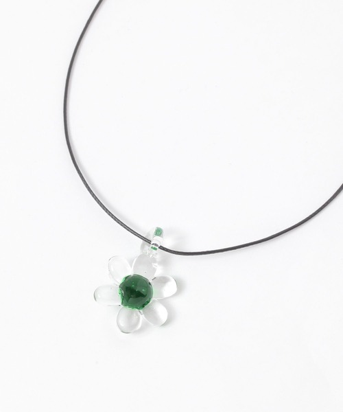 ■デザイン■ 繊細なガラス素材で仕上げたフラワーモチーフのネックレス。 ブラックコードを合わせることで甘さを抑えた印象に。 ガラスならではの透明感がさりげなくきらめき、首元を上品に演出します。 シンプルなコーディネートにも取り入れやすいデザインです。