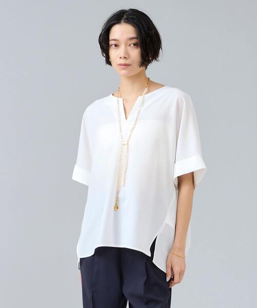 ゆったりとした身幅でリラックス感のあるプルオーバー。 【デザイン/コーディネート提案コメント】 ドルマンスリーブの5分袖が腕周りを自然にカバーし、 1枚で着映えするトップスです。 フロントのスリット開きがすっきりとした印象をプラス。 単品使いはもちろん、同素材のボトム(品番:A0166FP333)との セットアップコーデもおすすめです。 【素材/お手入れコメント】 マットでドライタッチな梳毛調ストレッチ素材を採用。 上品な質感と軽やかな着心地が魅力です。 シワになりにくく、イージーケア仕様でデイリー使いにも最適。 さらに手洗い可能で、お手入れも簡単。 きれいめなスタイルをキープしながら、 快適さと実用性を兼ね備えた素材です。 ■透け感 なし ■伸縮性 ややあり ■光沢感 なし ■裏地 なし ■生地の厚さ 普通