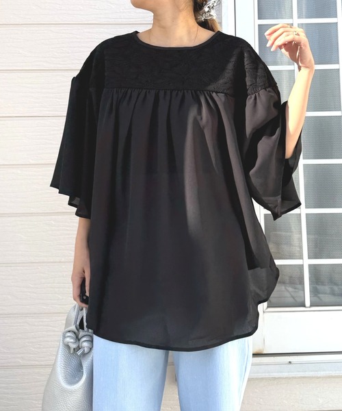 身に纏うだけで、いつもの日常が少し特別に感じられる主役級のブラウスです。 一見シンプルに見えてデコルテラインに施された繊細な花柄レースが、お顔周りをパッと明るく、華やかに彩ります。 身頃にはたっぷりとギャザーを寄せているので、気になるラインを拾わず、動くたびにふんわりと揺れるシルエットがとてもエレガントです。 上品な透け感と落ち感のあるお素材が、洗練された大人の女性を演出しお食事や観劇にも活躍します。 またジャケットを羽織ればオフィスでも浮かず、お仕事や学校行事でもおしゃれを楽しめます。 あえてデニムやカジュアルパンツと合わせて頂き、休日のキレイ目カジュアルとしても成り立つ1着です。 袖口にかけて広がるフレアースリーブは、手首も細く見せてくれるため、体型カバーも叶えつつ、華やかに見せたいという欲張りな願いをかなえてくれます。 ※商品の色味は、撮影場所や光のあたり具合などにより色味が違って見える場合がございます。 また、ご覧のモニター環境や撮影環境により実際の商品と多少色味が異なって見える場合がございます。 予めご了承の上ご注文下さい。 《インフォメーション》 ◆商品のお気に入り登録 完売していても再入荷時に再入荷通知を受け取ることができますので、是非ご登録ください。 ◆ブランドのお気に入り登録 新商品や再入荷などの情報を受け取ることができますので、是非ご登録ください。