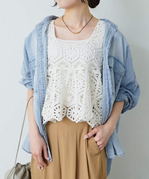 PUAL CE CIN 2026 SS collection 【EFFORTLESS LUXE】 ◇ふんわりフェミニンなかぎ編み風ビスチェ◇ ●商品のお気に入り登録 クーポンやタイムセール、再入荷通知やラスト1点などお得な情報を受け取ることができます。 ご登録をお忘れなく◎ ●デザイン フレアな形で、柔らかい印象のかぎ針を使ったレース編み風ビスチェ。 たっぷりの身幅を持ち合わせたフレアシルエットで、 動くたびに柔らかく揺らめき、上品な女性らしい印象を与えます。 ウエストほどの丈感と広い袖口で、 合わせるインナーを悩まなずコーディネートを組みやすいのも嬉しいポイント。 季節に合わせたインナーと組み合わせることで、ロングシーズン着用いただけます。 ●スタイリング カットソーやシアーシャツに合わせて、春先や秋口も着用いただけます。 デニムパンツと合わせて、カジュアルなコーディネートから、 スラックスでキレイ目まで幅広くお使いいただるアイテムです。 ●素材 かぎ編みの立体感を感じられるサラッとした素材です。 =============================== 洗濯方法:手洗い可/ドライクリーニング/ウェットクリーニング もみ洗いは避け、押し洗いをしてください。 透け感:あり 裏地:なし 伸縮性:なし 光沢感:なし 生地の厚さ:普通 【スタッフコメント】 年齢:20代前半/身長:153cm/普段着用サイズ:S~Mサイズ 着用感:ウエストほどの着丈ですが、フレアなシルエットでウエスト周りを覆ってくれる安心感があります。 広い袖口で、インナー合わせに困らず着用できました。 =============================== ※着用、お取り扱いの際は、商品についている品質表示とアテンションタグを必ずご確認下さい。 ※撮影場所やお使いのモニター環境により若干お色味が異なる場合がございます。特にロケの撮影では明るく見える傾向にございます。 ※予約商品はサンプルで撮影をしております。若干の仕様が変更になる場合がございますので予めご了承の上ご注文くださいますようお願いいたします。 【予約品の入荷時期について】 店舗入荷時期と予約商品のお届け時期が異なる場合がございますので、予めご了承ください