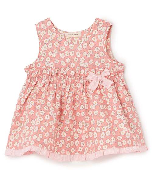 コーディネートの主役になるような小花柄のチュニックです。 リボンと裾に別地のストライプを合わせ、さわやかな印象に仕上げました。 左肩はボタン明き仕様で、着脱しやすいのもうれしいポイント。 長袖のインナーをレイヤードしてもおしゃれに決まり、ロングシーズン着用できます。 【透け感】透けない 【生地の厚さ】普通 【伸縮性】なし 【裏地】なし 【ポケット】なし 【アジャスター】なし