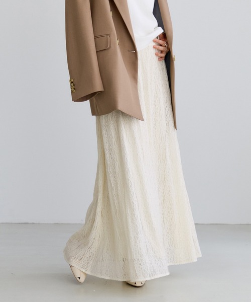 【2026 Spring/Summer】【26SS】 <POINT> ・春らしい動きのあるレースが今年らしいSKIRT ・ぐるりゴムでイージに履けるのも嬉しいポイント ・きらっとしたスパンコールがコーディネートのアクセントに 【デザイン・シルエット】 ぐるりゴムでイージーに履けるレーススカート。広がり過ぎないフレアーシルエットでスタイリングしやすいデザインになっています。 【素材】 軽やかレース素材にスパンコールが散りばめられた素材です。 【カラー】 デイリーに使いやすいブラック、キナリの2色展開。 【おすすめのスタイリング】 カジュアルにTシャツやスウェットと合せたり、ジャケットなどの綺麗目なアイテムとの相性も◎。オンオフで活躍する万能アイテムです。 ----------------------------- 裏地:あり 光沢感:なし 透け感:あり 伸縮性:あり ウエスト:ゴム ポケット:なし 生地の厚さ:普通 その他仕様:レースにラメ糸使用 季節:春、秋 ----------------------------- 【モデル着用サイズ】 身長:160cm 着用サイズ:F ※画像の商品はサンプルです。 実際の商品と仕様、加工、サイズが若干異なる場合がございます。 ※画像によっては実際の色味と異なる場合があります。正しい色味は生地アップ画像をご確認ください。