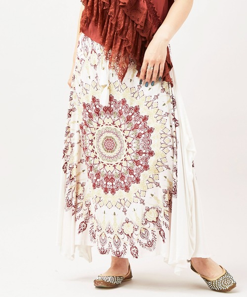 エキゾチックなマンダラ模様が目を惹く変形スカート。 さらりとしたレーヨン生地で落ち感があり、リゾート気分を盛り上げる華やかなデザイン。 コーデの主役に大活躍◎ ※こちらの商品は1点1点職人による手作りとなります。その為、生地の取り方により柄の出方や形・色合いなど若干異なる場合がございます。あらかじめご了承ください。 Amina Collection Co.,LTD.